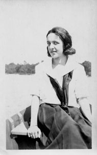 Here she is: a girl sitting in a rowboat on a lake. Sometimes the obvious takes a long time to sink in—the sailor blouse. The boat. Oh. That makes sense. She was fashionable and he took a lot of pictures of her, her many outfits. The quick description of her expression is “skeptical.” That’s not enough. Think: this was in the 1920s, about eighty years ago. She was going to have a life with him. I have pictures of her fifty years later. She no longer looks skeptical. Is this the look he fell in love with?
